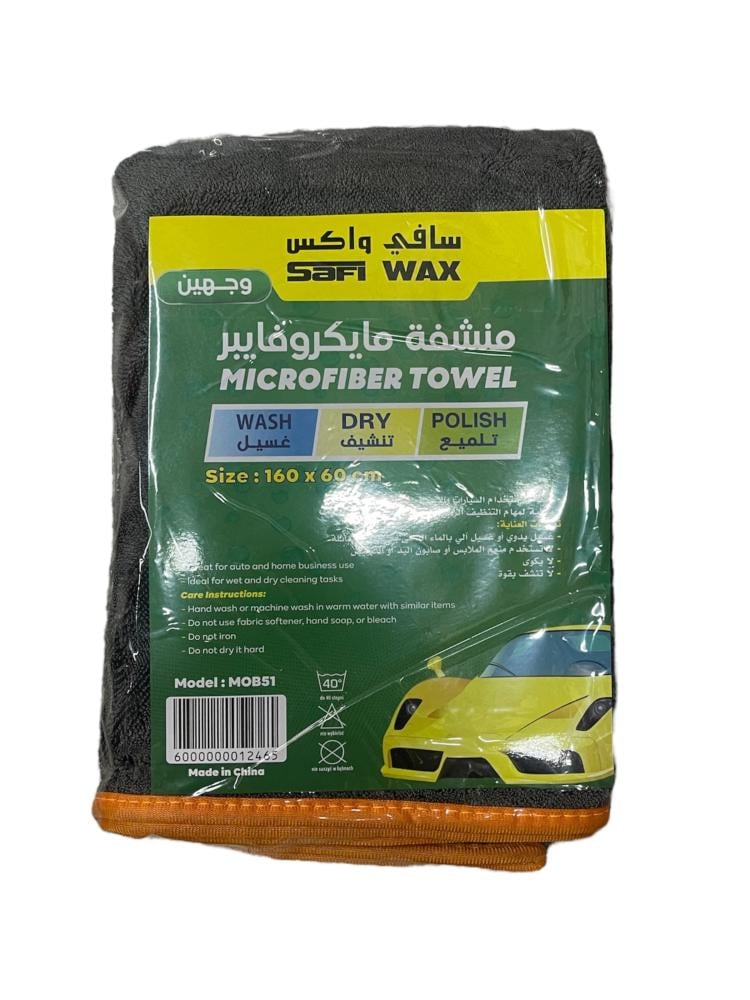 منشفة مايكروفايبر مقاس 160×60 سمالمميزات:ألياف فائقة النعومة.شعيرات غزيرة.التقاط الغبار الخفيف بالداخل.ناعمة جدا لا تسبب خدوش.آمنة على جميع الأسطح.وجهين متماثلين.سهلة العصر و التجفيف.المقاس:160×60 سم.الاستخدامات:توزيع و مسح الشمع السريع بعد غسيل و تجفيف المركبة.مسح بقايا الملمعات.طريقة الغسيل للحفاظ على جودة مناشف الميكروفايبر:غسل المناشف بشامبو مخصص لغسيل مناشف المايكروفايبر.استخدام ماء الصنبور.غسل المناشف الأقل اتساخًا ثم الأكثر اتساخًا.التجفيف يدويا أو بالتجفيف الهوائي, ونشرها بعيدا عن أشعة الشمس والغبار.تنويه:.إزالة شريط المعلومات من طرف المنشفة, وذلك لتفادي الخدوش أثناء الاستخدام.
